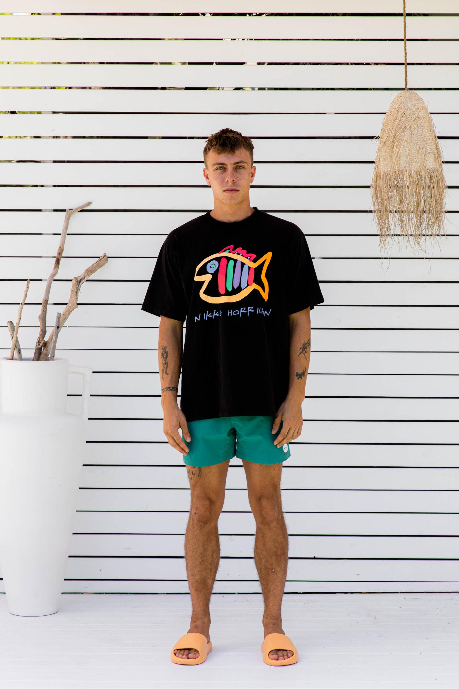 Get into summer with this retro inspired tee. Cut from smooth cotton-jersey and slightly distressed, it has a colorful tropical fish print across the front and features a thick neck collar. Styles with a pair of our lime sport shorts to emulate the look.